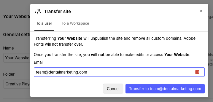 - In the Transfer site field, enter the following email address: team@dentalmarketing.com